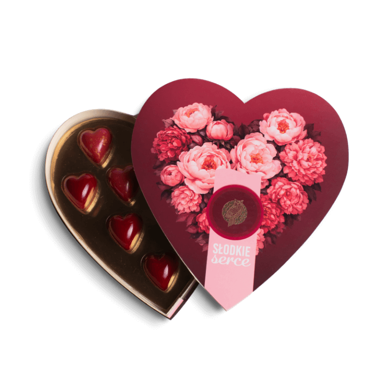 Zestaw pralin w kształcie serduszek: z czekolady rubinowej z ganaszem o smaku pomarańczowym oraz z czekolady mlecznej z ganaszem o smaku kawowym.