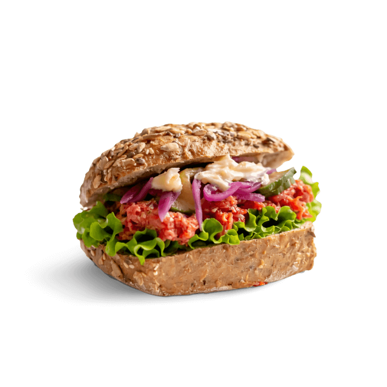 Bułka musli z metką paprykową, kremowym majonezem truflowym, piklami z ogórka i marynowaną cebulką. Wyrazisty smak przełamany świeżą kwasowością i aromatem trufli.