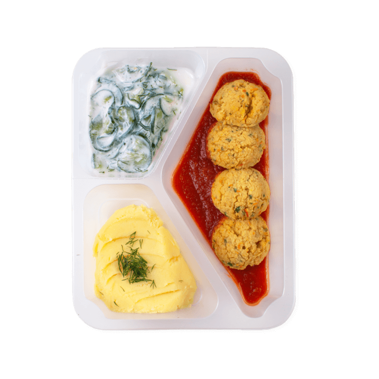 Soczysty kotlet de volay podany z aksamitnym puree ziemniaczanym i klasyczną mizerią z ogórka. Zrównoważona, pożywna propozycja lunchboxa łącząca tradycyjny smak z delikatnością dodatków.