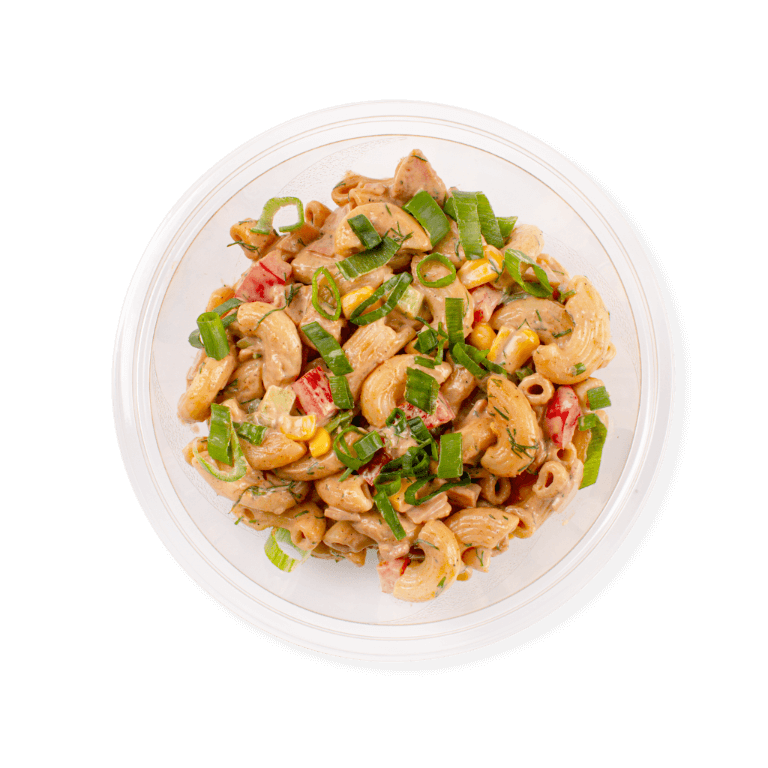 Sałatka z delikatną kaszą kuskus, grillowanym filetem z kurczaka, świeżym ogórkiem, papryką i szczypiorkiem, polana kremowym sosem majonezowym. Idealna, pożywna propozycja, która łączy świeżość warzyw z sycącą kaszą.