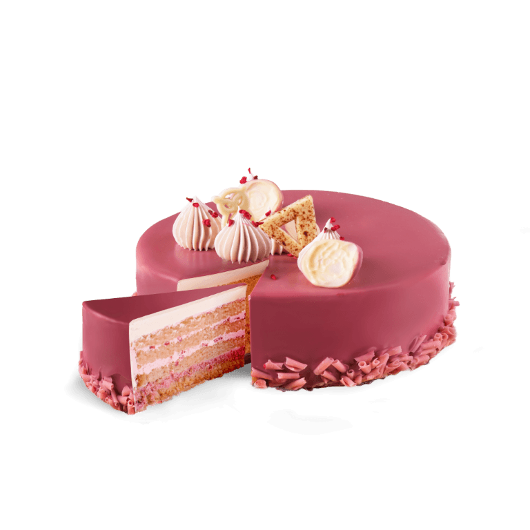 Biszkopt o smaku czekoladowym przełożony warstwą chrupiących ciasteczek, musem śmietanowym z białą czekoladą i nadzieniem malinowym.