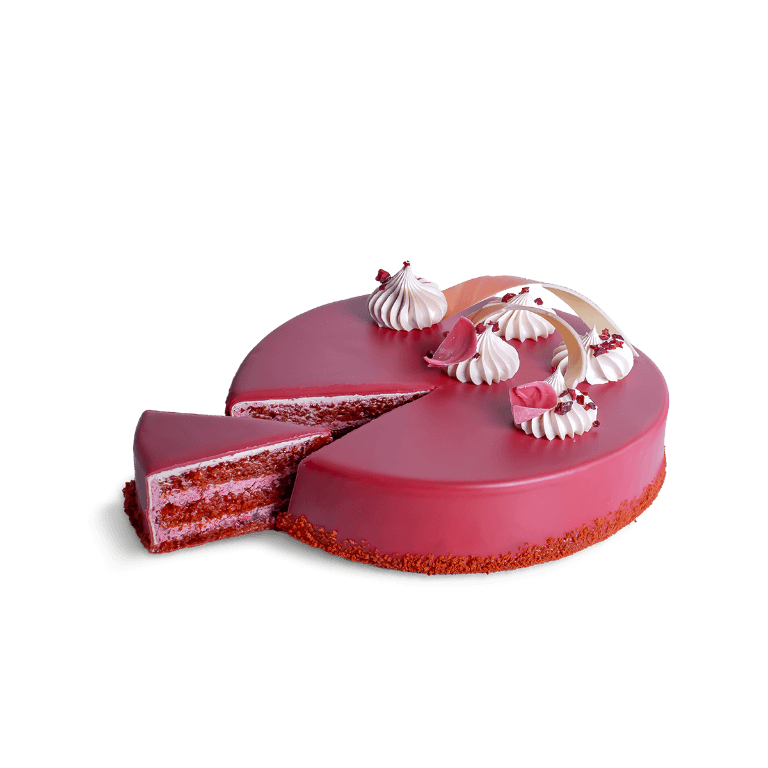 Biszkopt red velvet w połączeniu z chrupiącą warstwą prażynek i kremem wiśniowym.